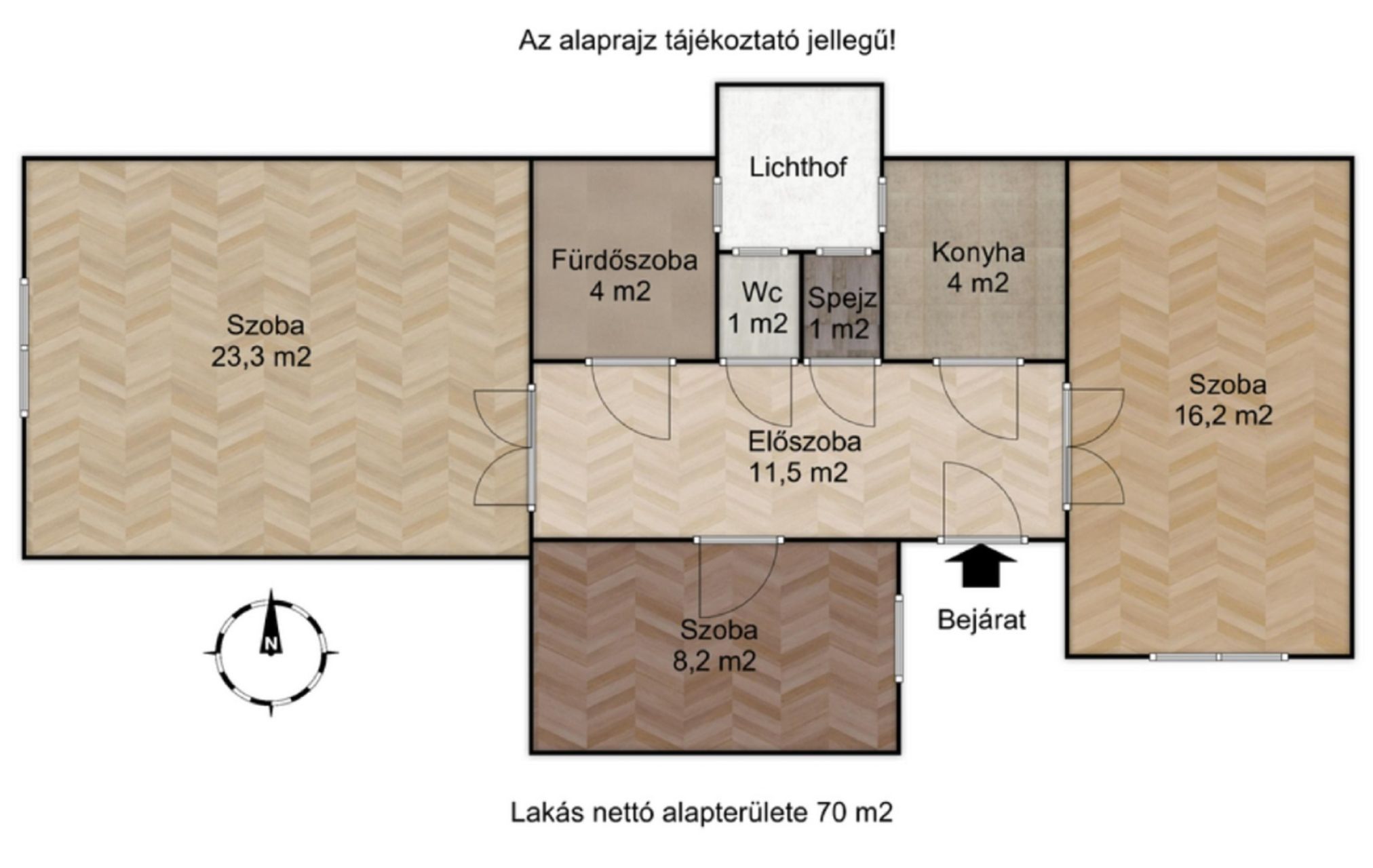 A lakás alapterülete 70 m2 a ház 3. emeletén helyezkedik el.