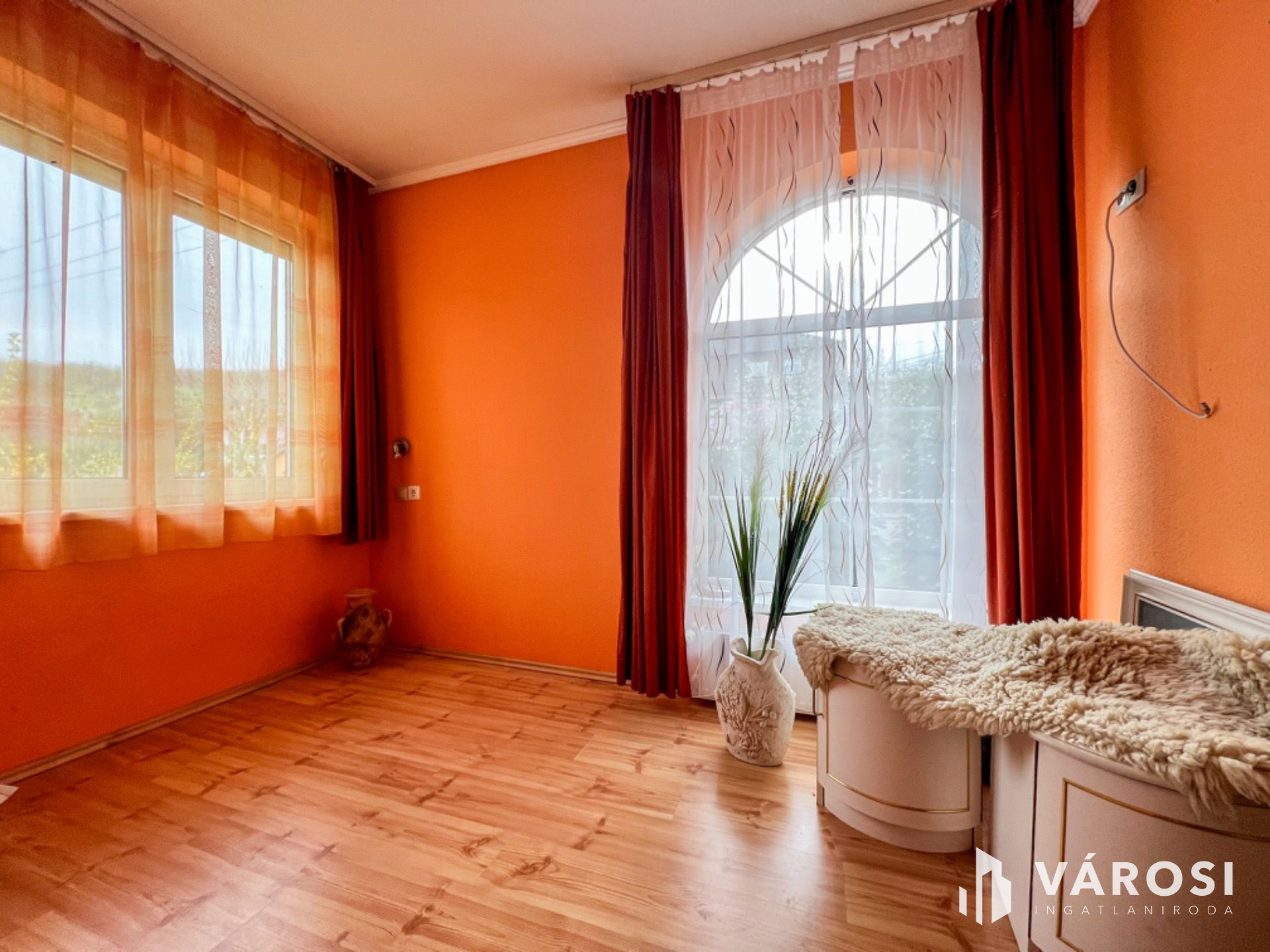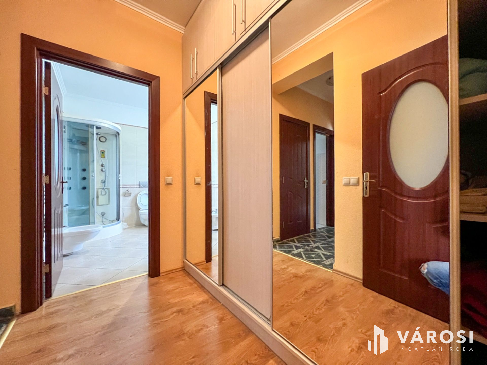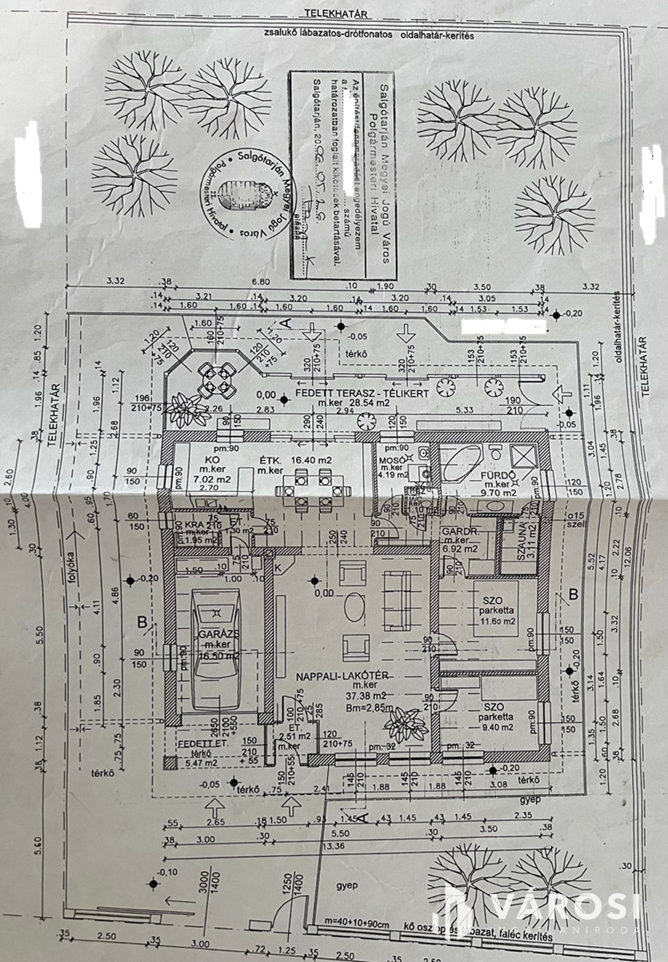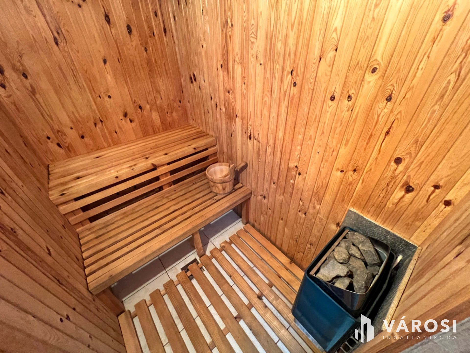 Helyiségei: 2 hálószoba, nappali, konyha+étkező, kamra, közlekedő, gardrób, mosóhelyiség, fürdőszoba, szauna, külön nyíló W.C., szélfogó, garázs, beépített terasz, nyitott terasz.