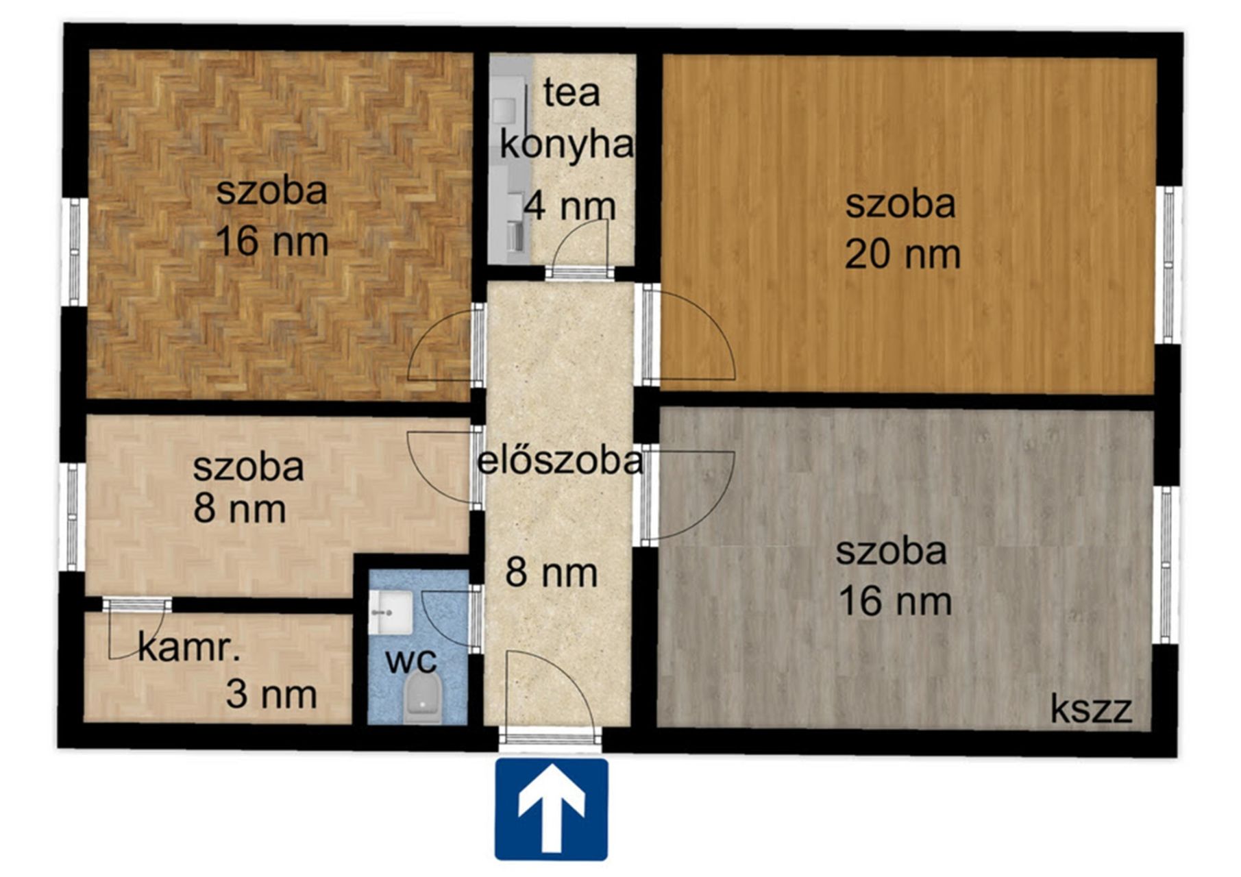 - 4 szoba, előszoba, teakonyha, kamra, WC.