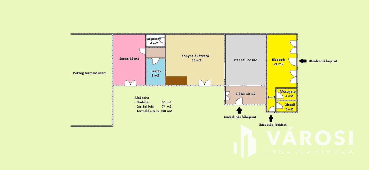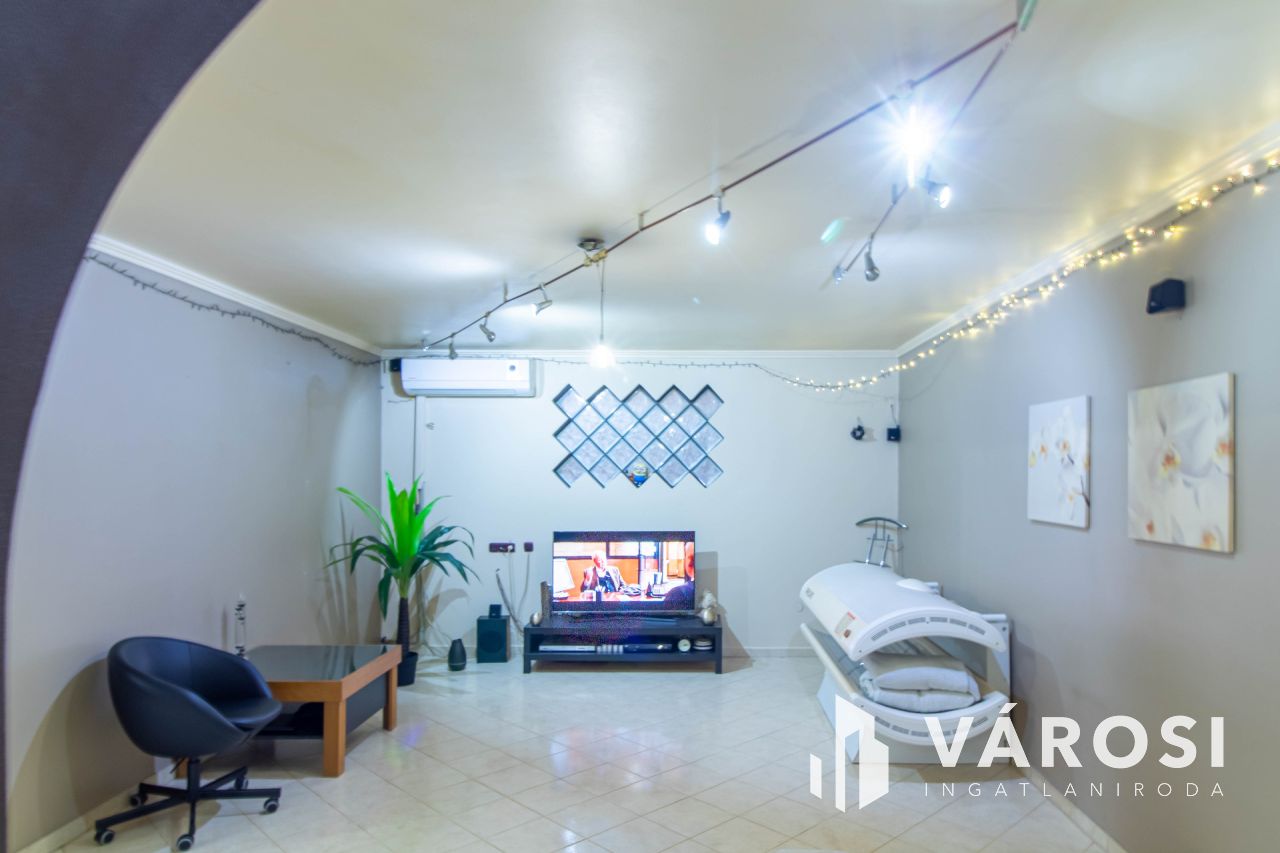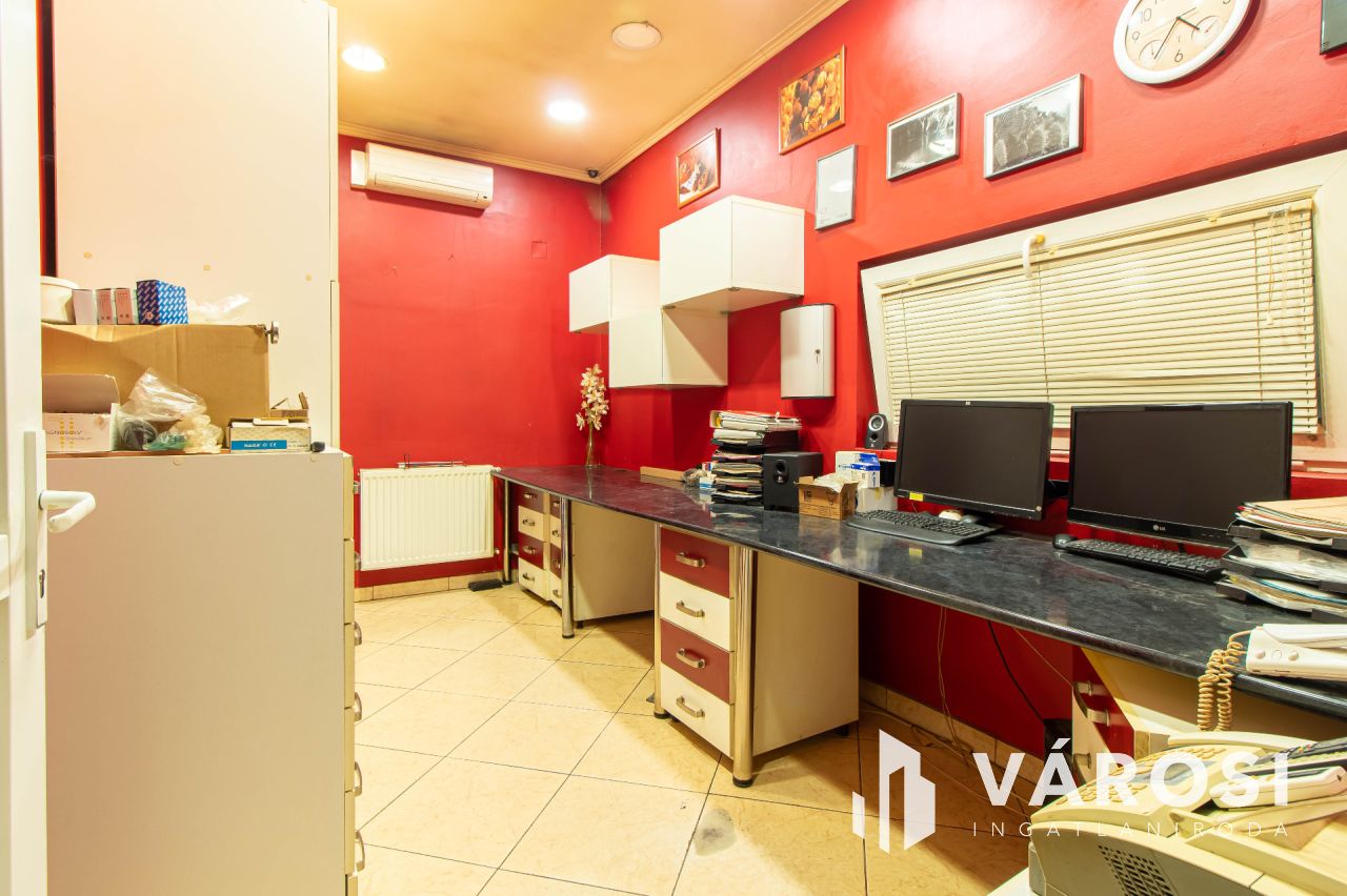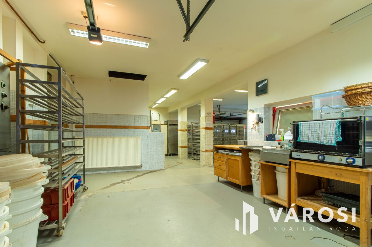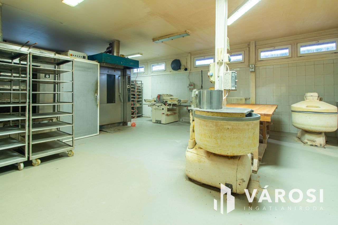Az ingatlan üzleti része korábban 1998-tól 2024-ig pékségként működött, és teljesen elkülönített közművekkel rendelkezik a lakóingatlantól. Az utcafronti eladótér 35 m²-es, míg a pékműhely az udvar hátsó részében helyezkedik el, összesen 177 m² alapterülettel. A pékség minden szükséges helyiséggel felszerelt: iroda, termelőhelyiség, hűtőkamra, áruátvevő, szociális helyiségek és raktár is rendelkezésre áll. A működés 2024-ig folyamatosan nyereséges volt, azonban családi okok miatt a termelés megszűnt, és az ingatlan most eladó. Az üzlethelyiség kiválóan alkalmas más élelmiszeripari tevékenységre, például hidegkonyha kialakítására vagy egyéb termelésre, de raktárként, üzletként is remek lehetőségeket rejt magában.