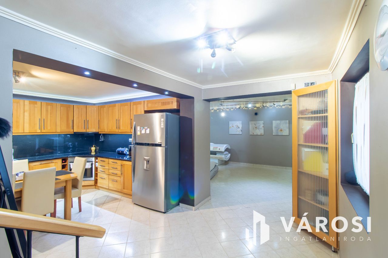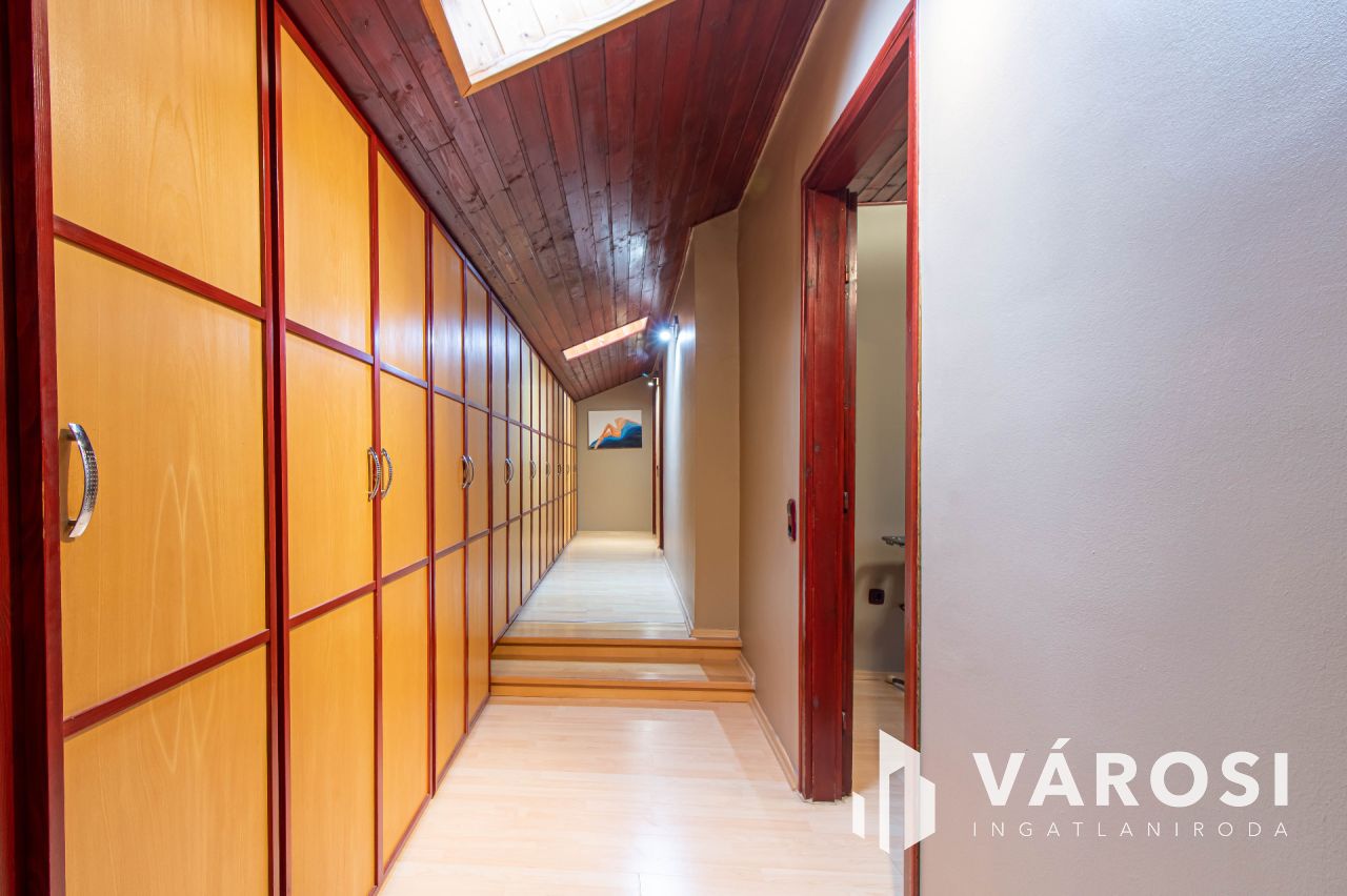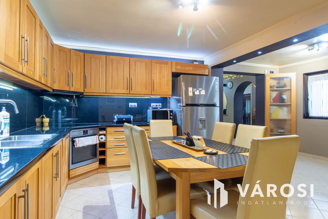 A 2007-ben teljeskörűen átépített és átalakított családi ház 179 m²-es, amelyhez egy 28 m²-es garázs is tartozik. Az alsó szinten egy tágas előtér, egy világos, egybenyitott nappali-konyha-étkező, egy hálószoba és egy fürdőszoba található. Az ingatlan ezen a szinten padlófűtéssel rendelkezik, valamint két hűtő-fűtő klíma biztosítja a megfelelő hőmérsékletet. Az emeleten négy hálószoba kapott helyet, melyek közül az egyik közel 40 m²-es, így akár ketté is osztható. Két szoba teraszkapcsolatos, a folyosón beépített szekrény, valamint egy további fürdőszoba található. Az emeleti helyiségek radiátoros fűtéssel és három hűtő-fűtő klímával vannak ellátva. A ház minden részlete a minőséget és a modern kényelmet tükrözi, a vízhálózat vízlágyítóval van felszerelve, az udvarban pedig egy fűtött, vízforgatós medence biztosítja a kikapcsolódás lehetőségét.
