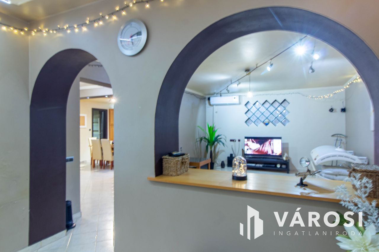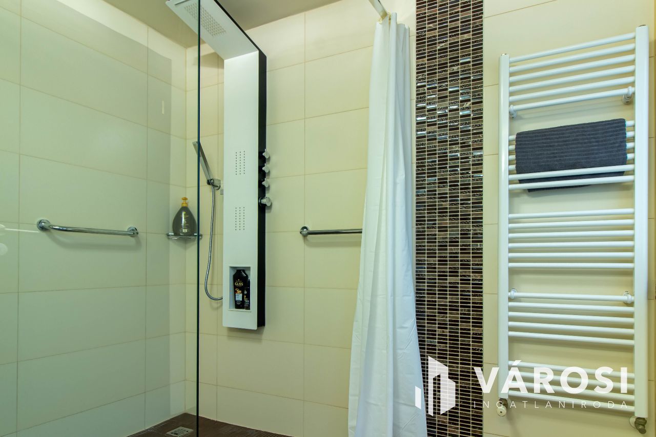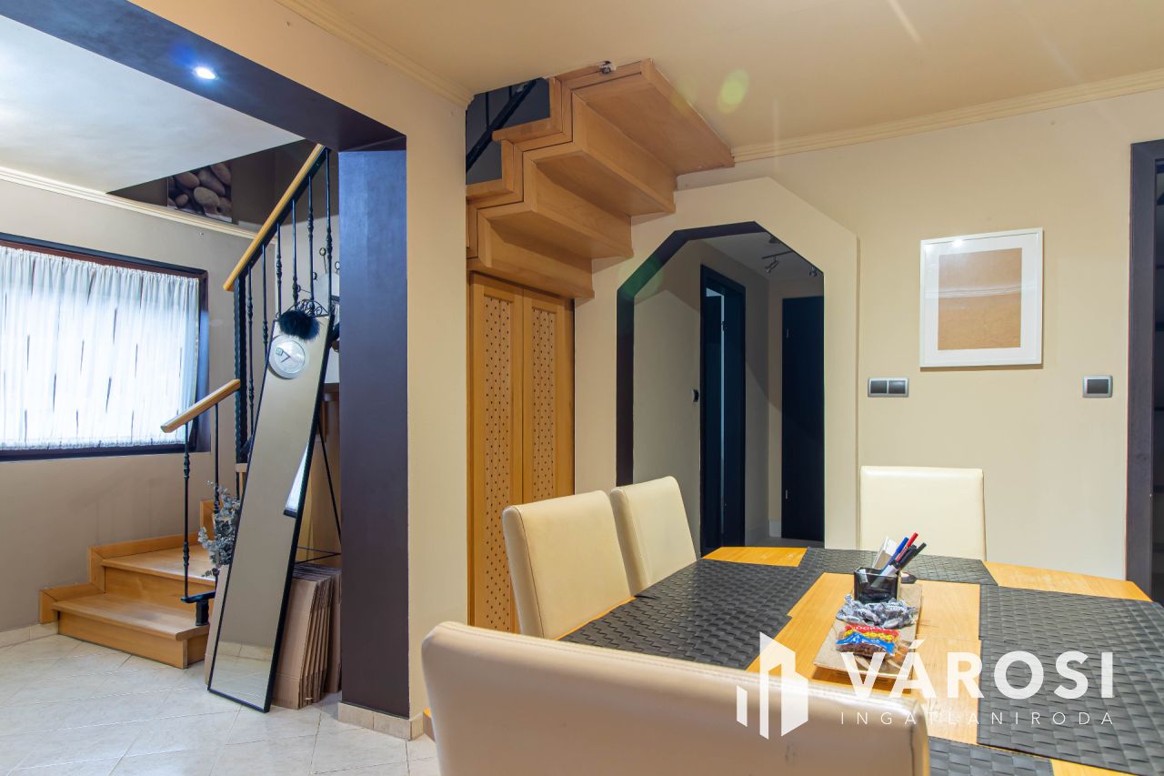 A 2007-ben teljeskörűen átépített és átalakított családi ház 179 m²-es, amelyhez egy 28 m²-es garázs is tartozik. Az alsó szinten egy tágas előtér, egy világos, egybenyitott nappali-konyha-étkező, egy hálószoba és egy fürdőszoba található. Az ingatlan ezen a szinten padlófűtéssel rendelkezik, valamint két hűtő-fűtő klíma biztosítja a megfelelő hőmérsékletet. Az emeleten négy hálószoba kapott helyet, melyek közül az egyik közel 40 m²-es, így akár ketté is osztható. Két szoba teraszkapcsolatos, a folyosón beépített szekrény, valamint egy további fürdőszoba található. Az emeleti helyiségek radiátoros fűtéssel és három hűtő-fűtő klímával vannak ellátva. A ház minden részlete a minőséget és a modern kényelmet tükrözi, a vízhálózat vízlágyítóval van felszerelve, az udvarban pedig egy fűtött, vízforgatós medence biztosítja a kikapcsolódás lehetőségét.