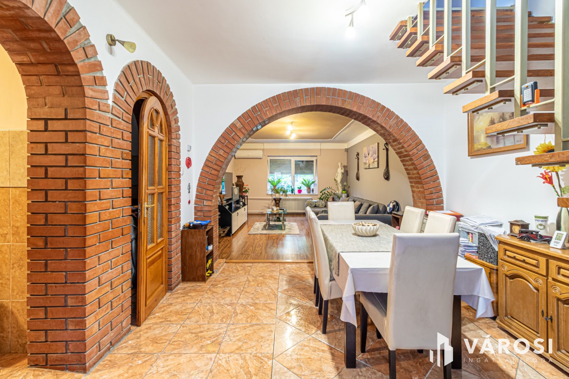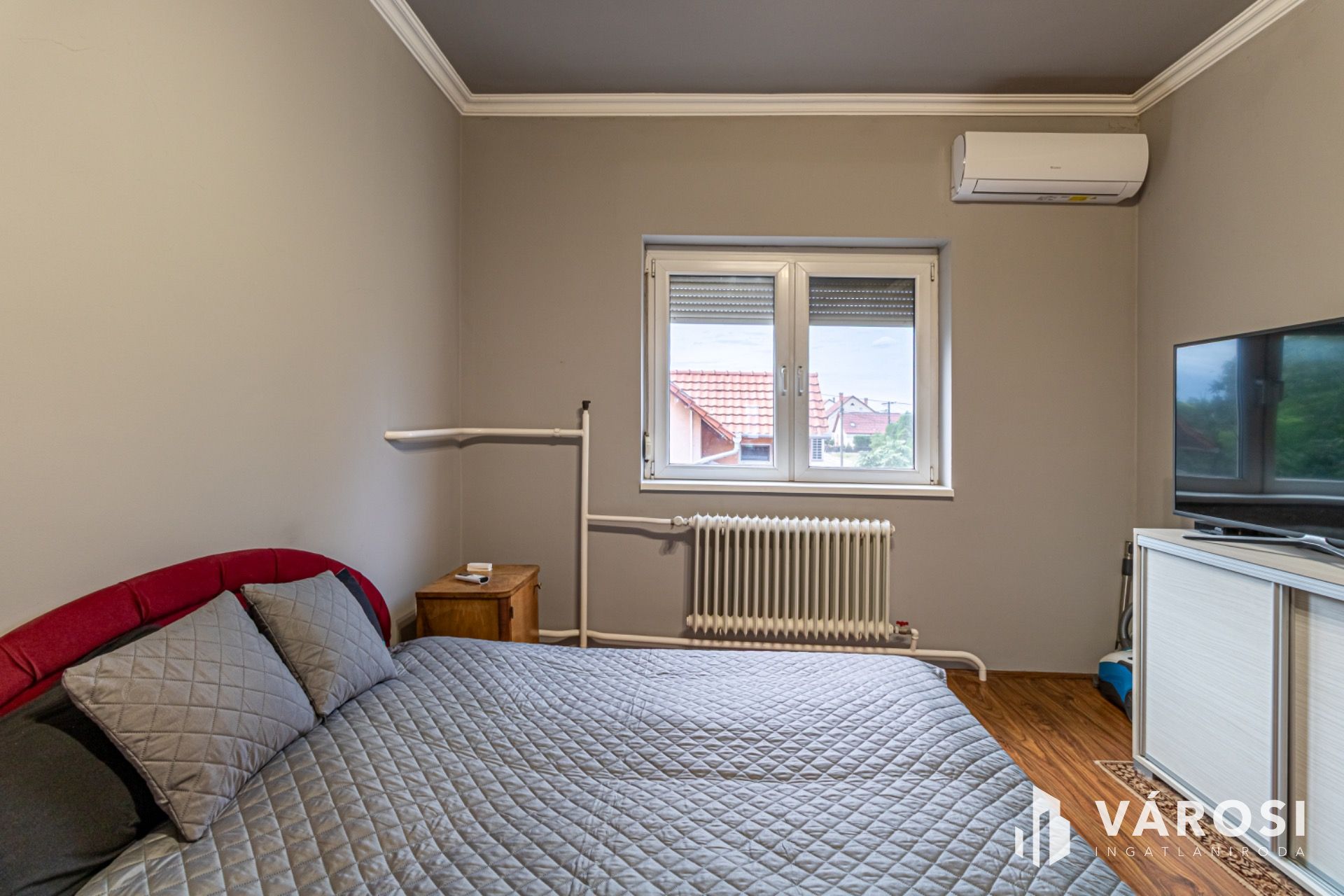 A nagyobb alapterületű lakrészben a földszinten egy tágas szobával, az emeleten három szobával rendelkezik, vegyes tüzelésű kazán+gázkazán fűtéssel, műanyag nyílászárókkal, redőnyökkel, valamint 2 hűtő-fűtő klímával.