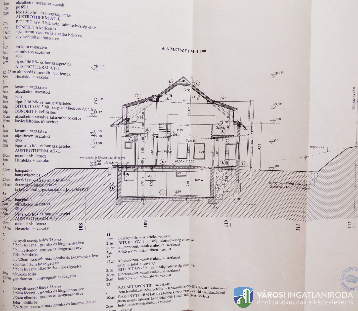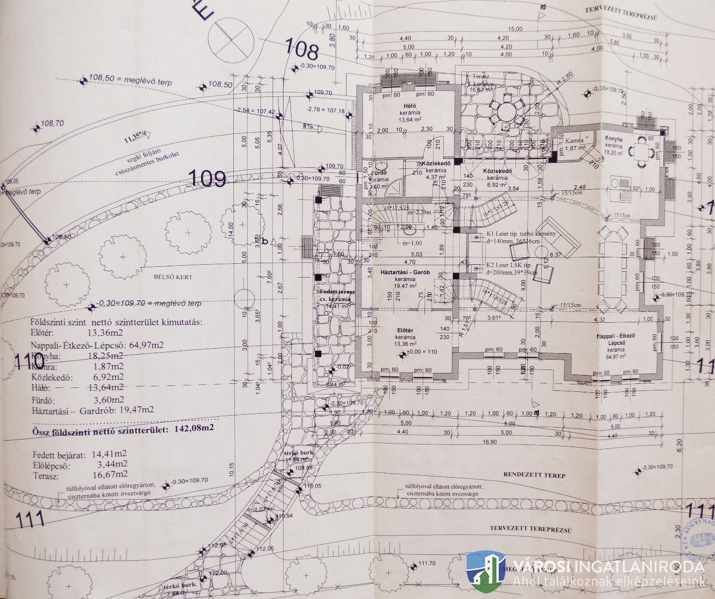 A területből 9278 nm részben lekerített építési terület, rajta 65 %-os készültségű 342 nm-es családi házzal.