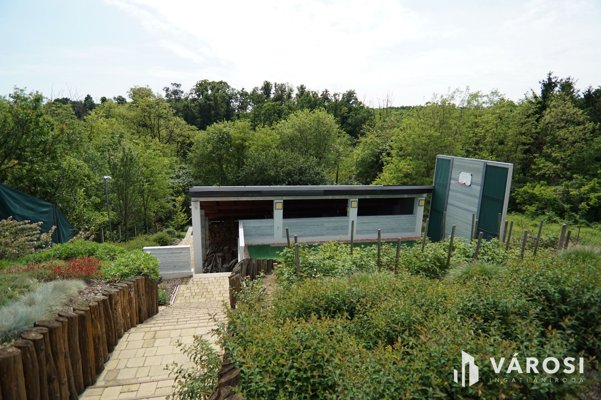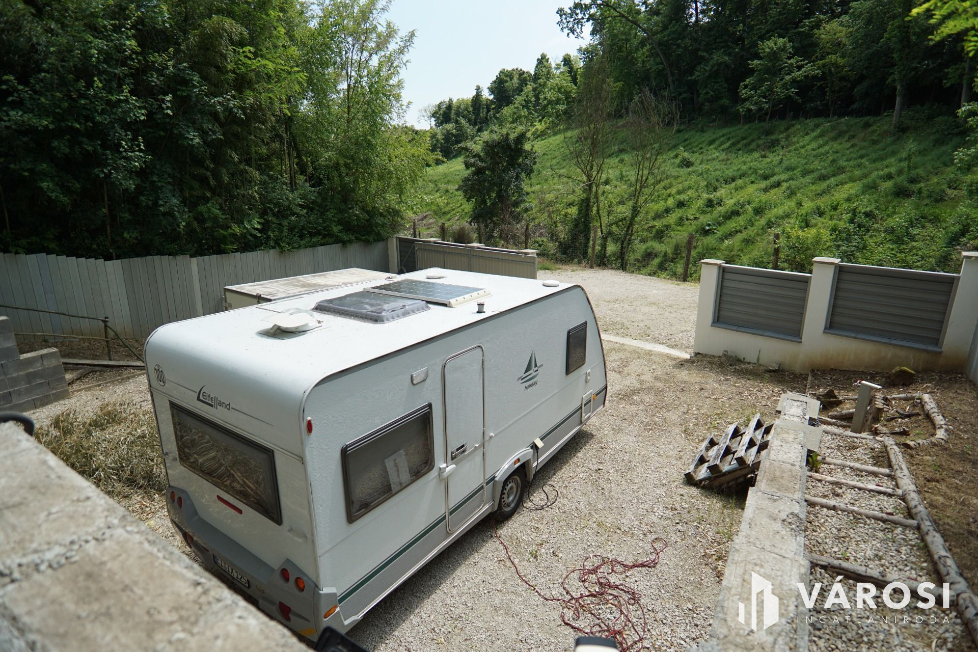 A telek, két utcából megközelíthető alsó részén egy szép kis erdő található, valamint egy parkoló ahová a víz és a villany bevezetése is megtörtént.