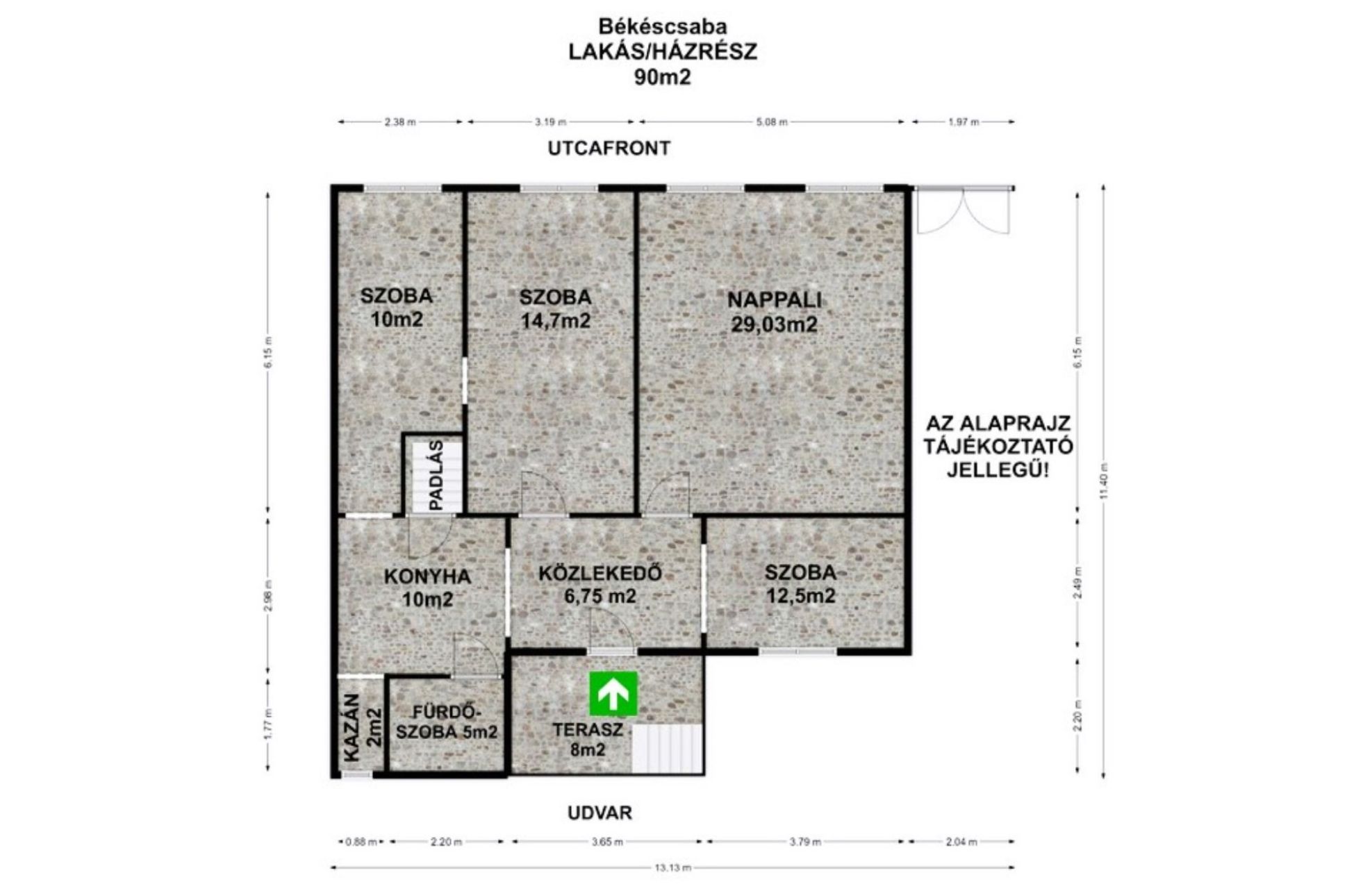 + Belmagassága 3,2 méter, külső falai 60cm vastagságúak, vegyes falazatú, polgári stílusú épület.