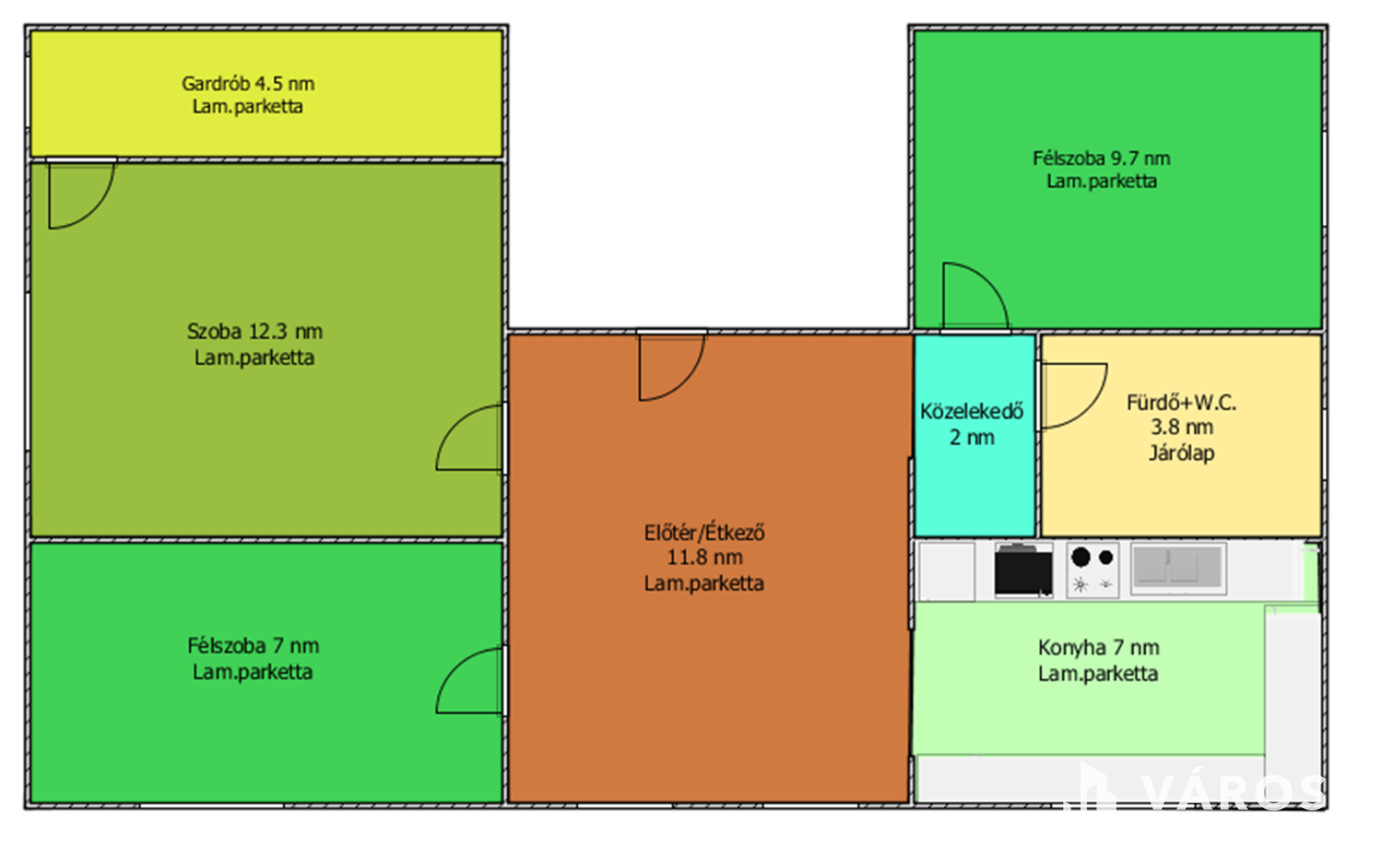 Az ingatlanban 1 szoba, 2 félszoba, gardrób, konyha, étkező/előtér, fürdőszoba, közlekedő található.