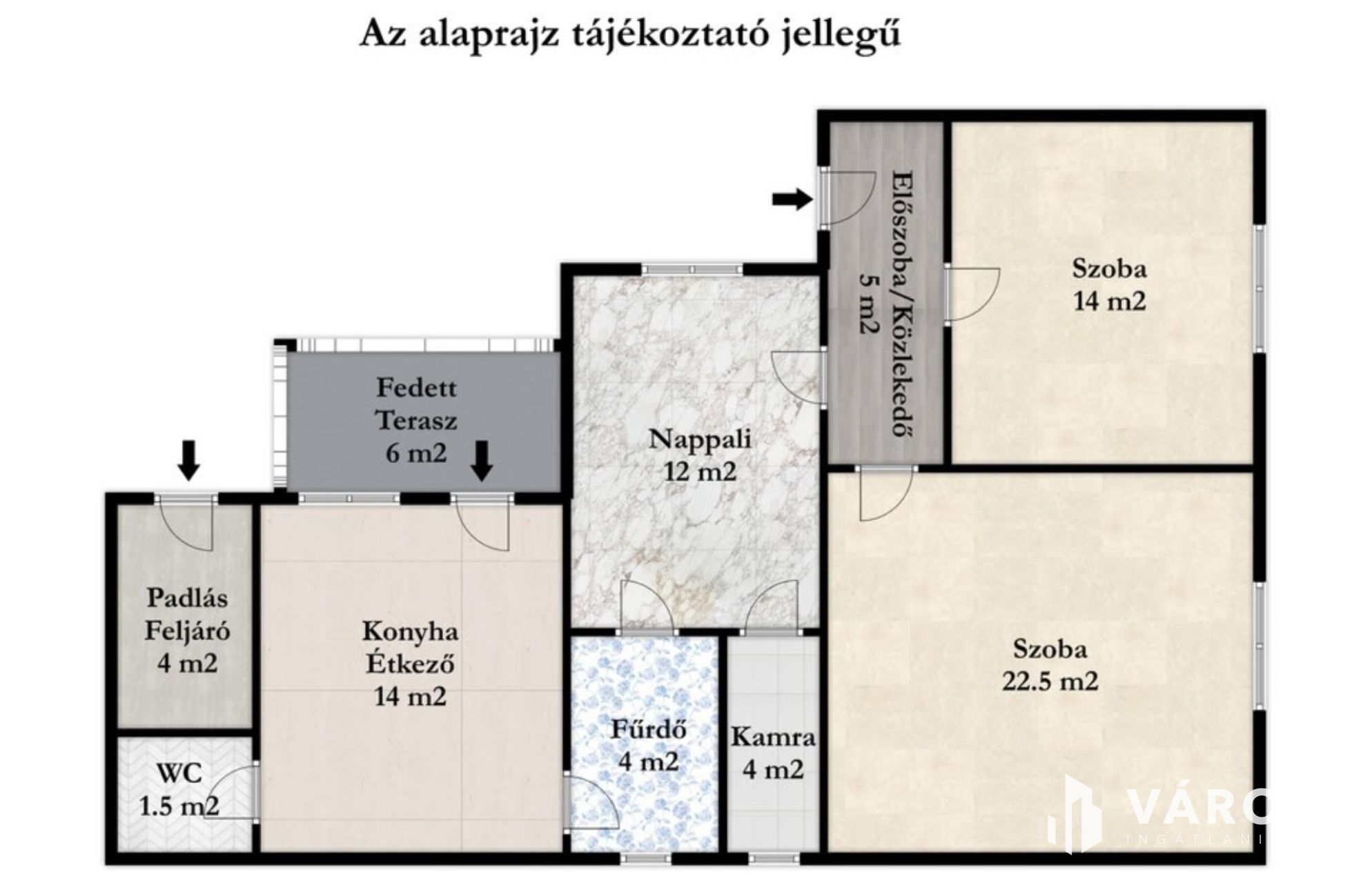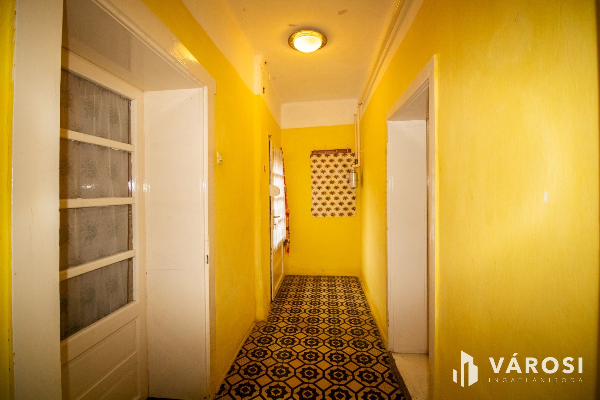 Az előszobából nyílik a 3 szoba. A kádas fürdőszoba villanybojlerrel felszerelt, a mellékhelyiség külön helyiségben található. A konyha-étkező tágas, innen egy második bejáraton keresztül a hátsó udvar is közvetlenül megközelíthető, ami a mindennapokban kifejezetten kényelmes megoldás. A kamra hasznos tárolóteret biztosít, a kb. 6 négyzetméteres fedett terasz pedig kellemes átmenetet képez a lakótér és a kert között.