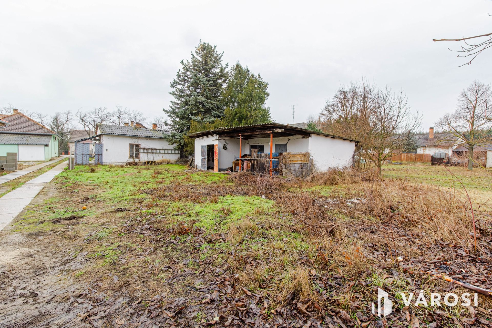 100 m²-es lakóház(alatta pince) + 2 melléképület – Erősen felújításra szorul vagy bontással tiszta fejlesztési terület nyerhető.