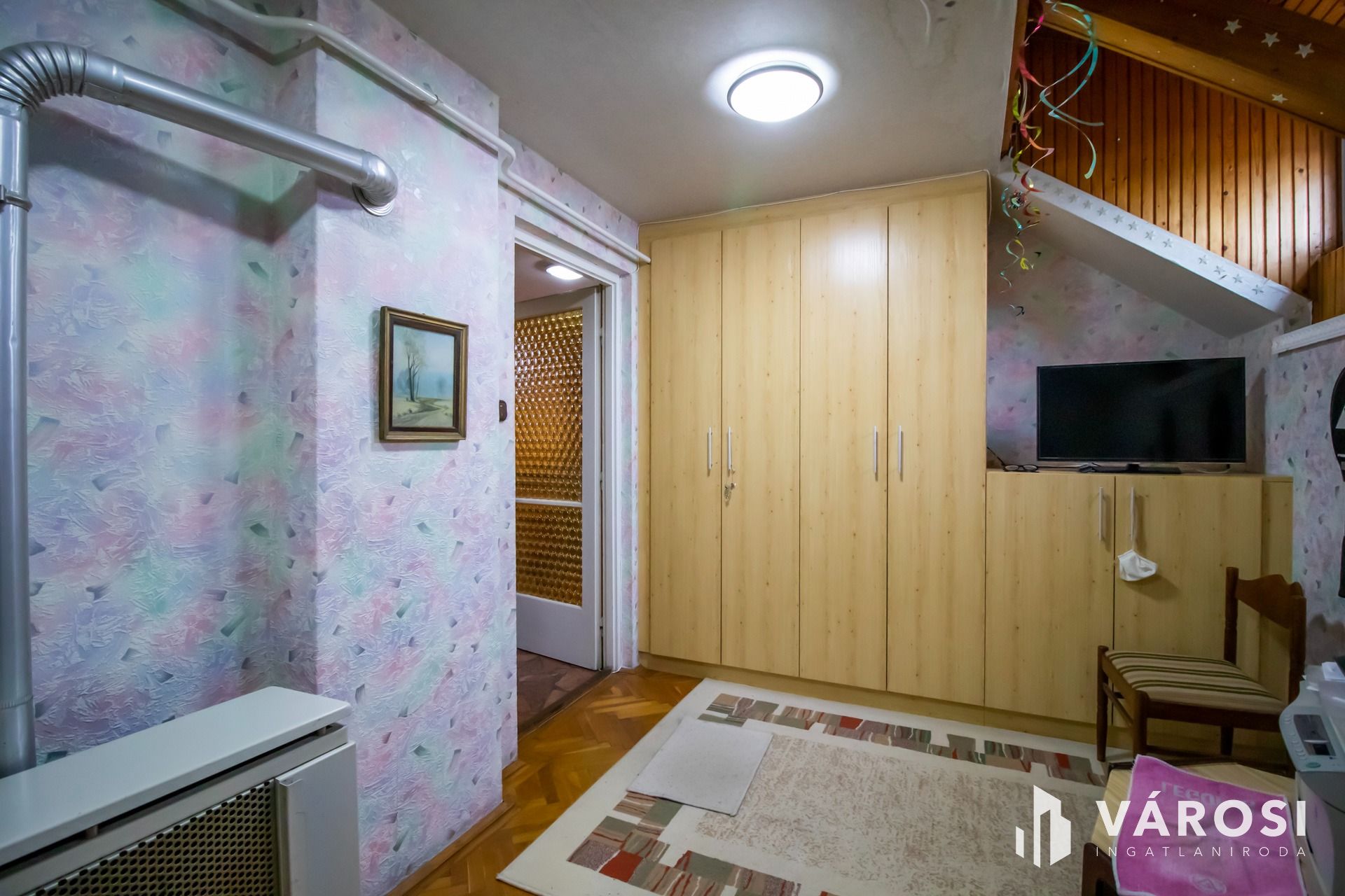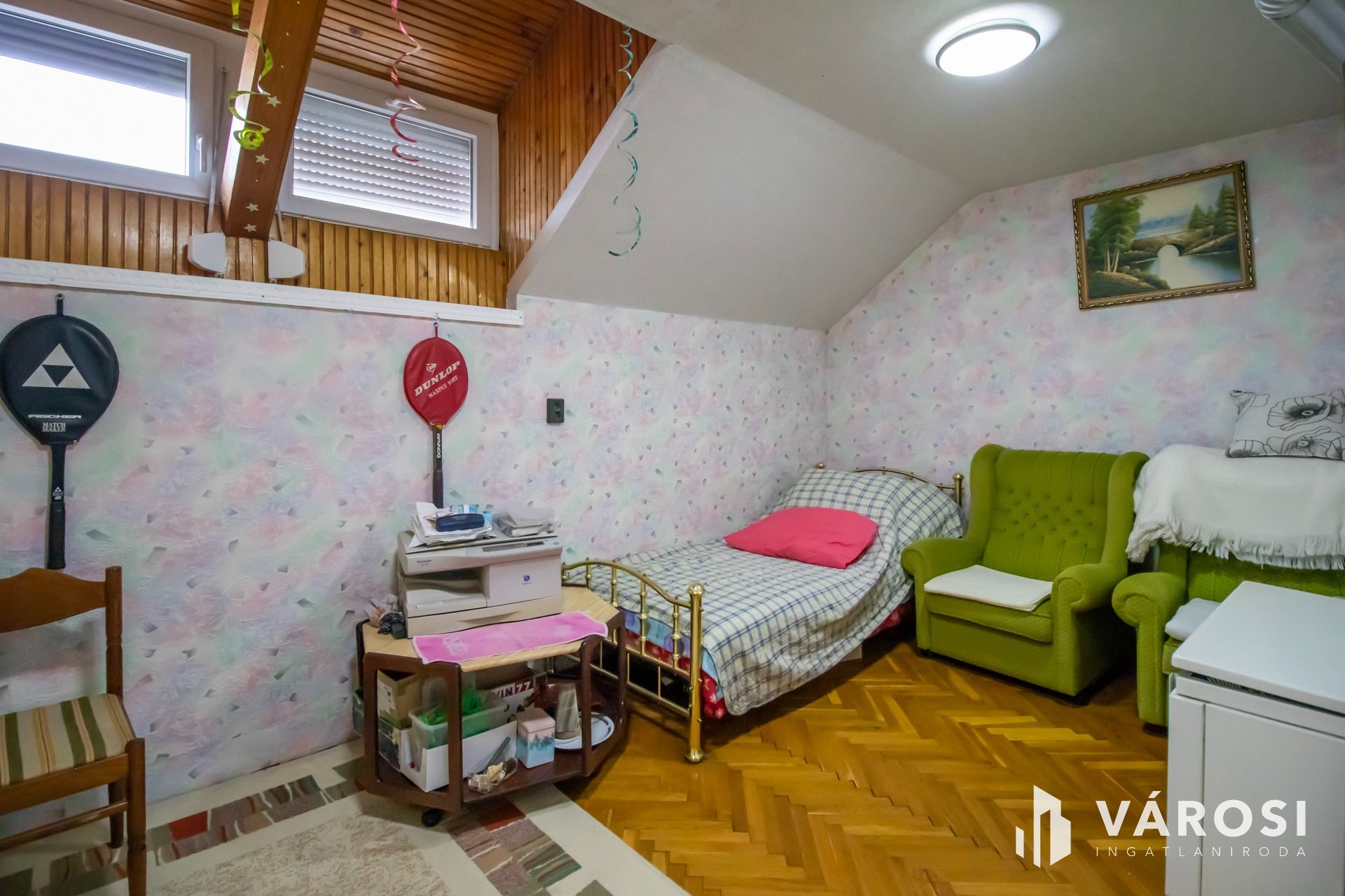 A felső szinten 2 darab nagy méretű szoba található, valamint tágas kádas fürdőszoba WC-vel, 43 négyzetméteren. Innen közelíthető meg a tárolásra alkalmas kis padlástér is.