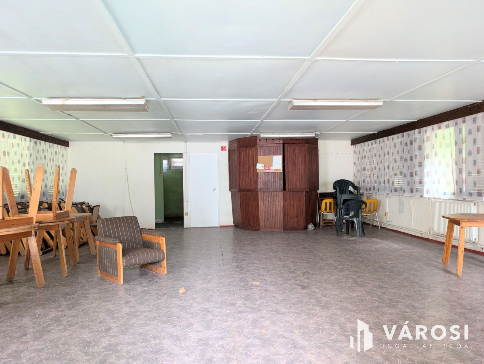- 1 db közösségi épület (közös helyiség, raktár, büfé, vizesblokk, 102 m2)