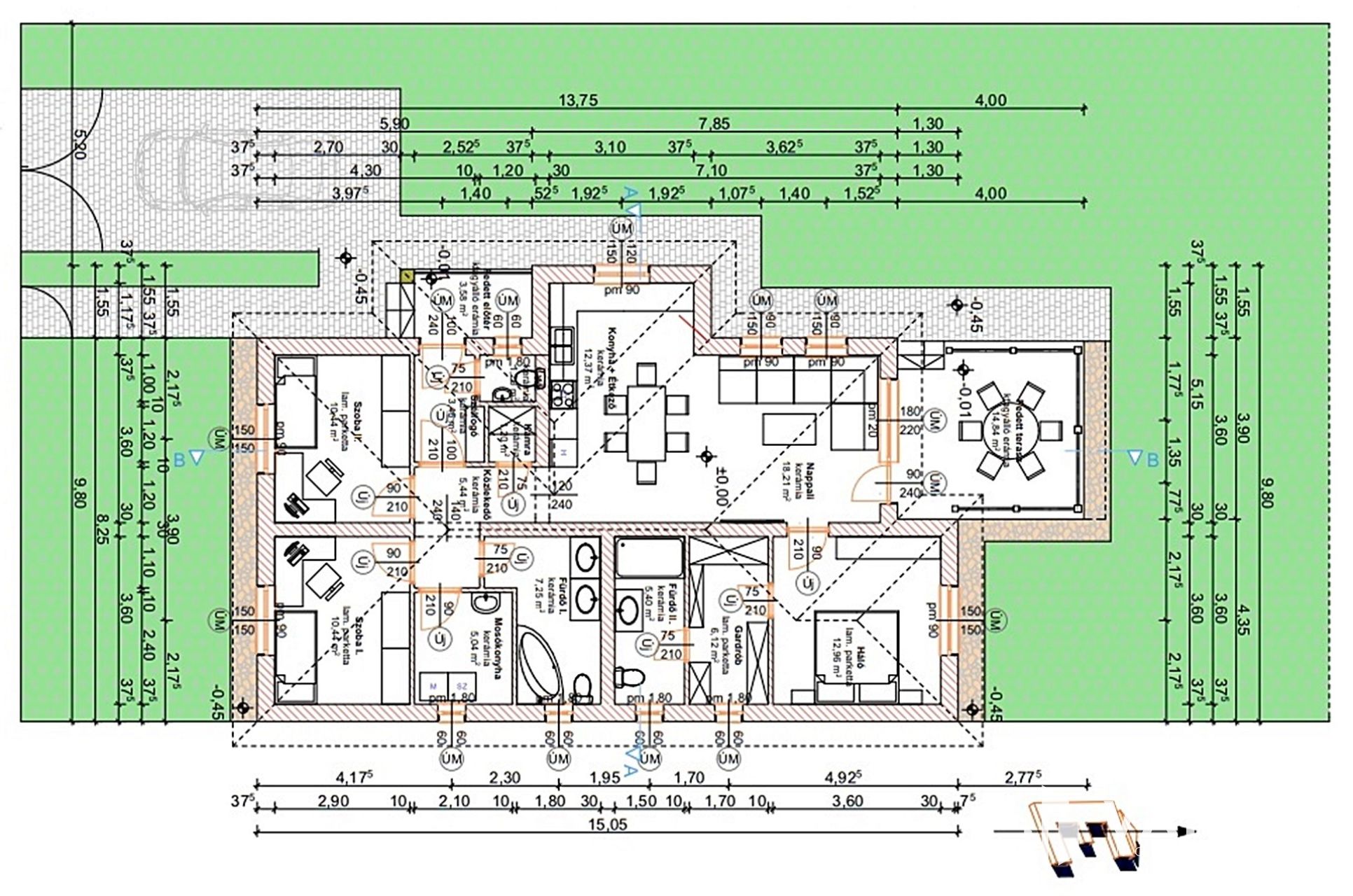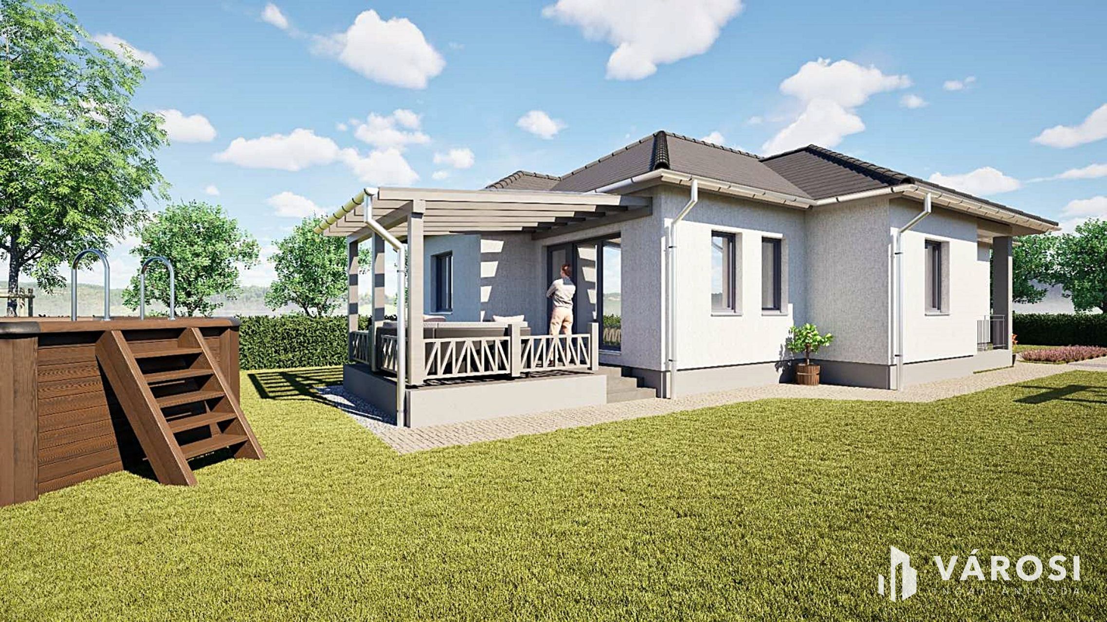 A ház kialakítása átgondolt és élhető: világos nappali kapcsolódik a konyha-étkezőhöz, három külön nyíló szoba, két fürdőszoba, gardrób, kamra és mosókonyha szolgálja a kényelmet, míg a fedett terasz tökéletes helyszíne lehet a pihenésnek vagy baráti összejöveteleknek. Az egyszintes kialakítás minden korosztály számára praktikus és időtálló megoldás.