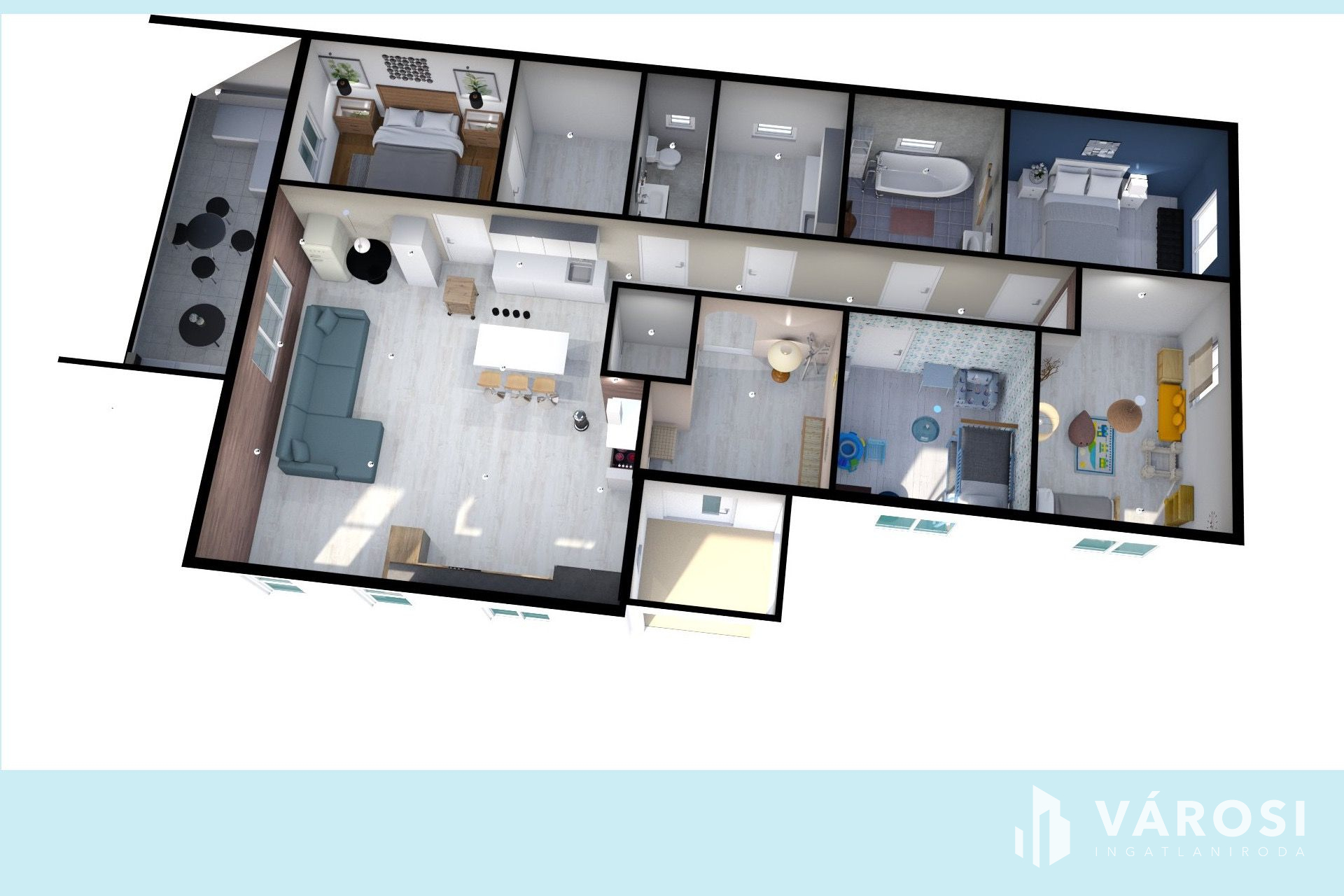 - 125 m2 alapterületen, tágas előszoba, közlekedő, AMERIKAI KONYHÁS NAPPALI, kamra, + 4 HÁLÓSZOBA, gardrób,