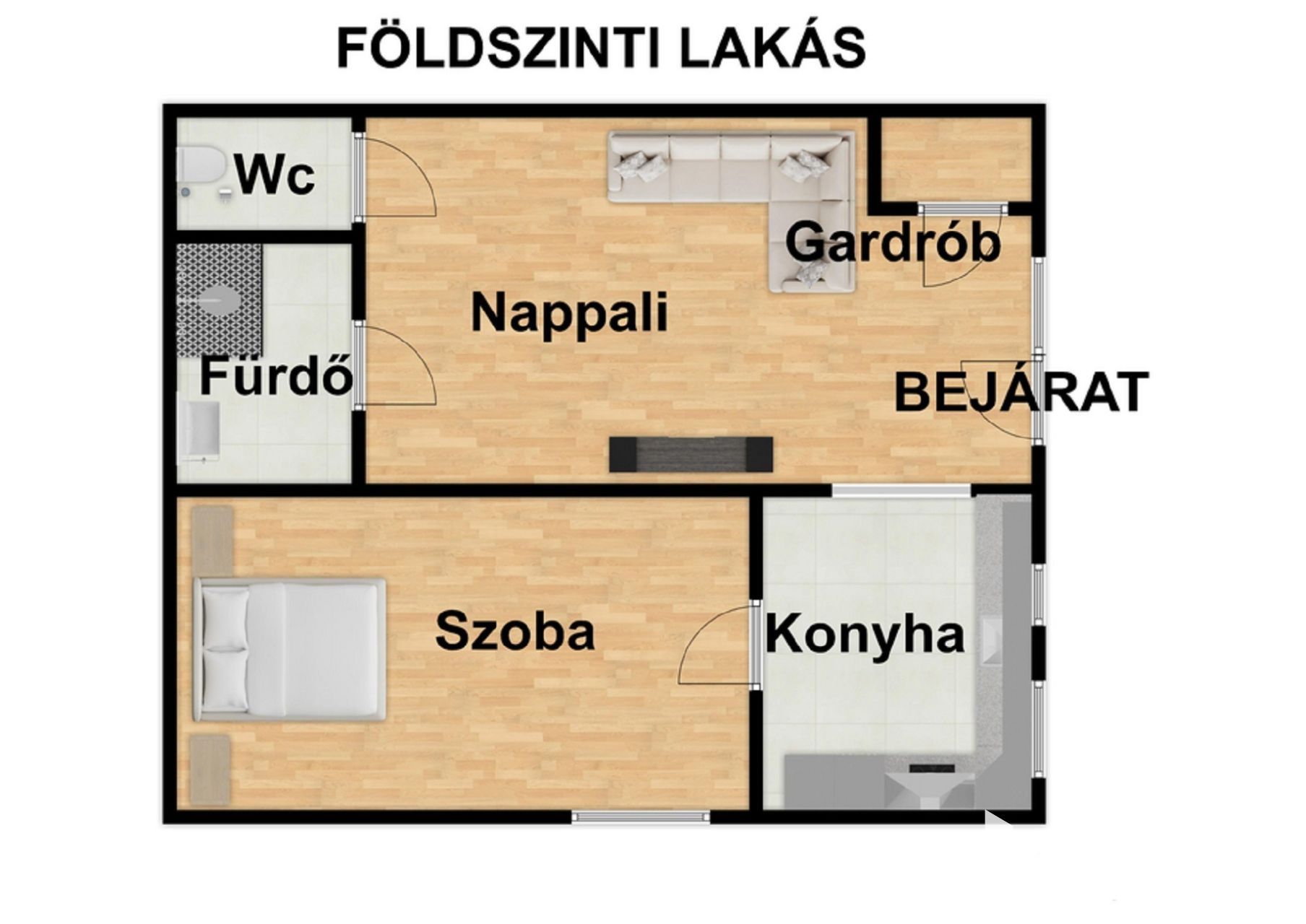 -földszinti lakás 40nm-es(nappali, szoba, fürdőszoba, konyha és wc)