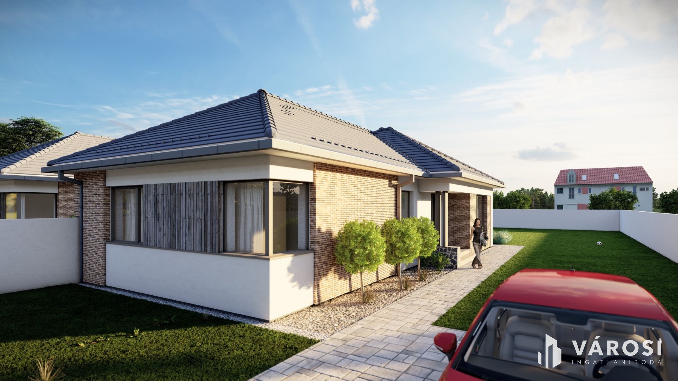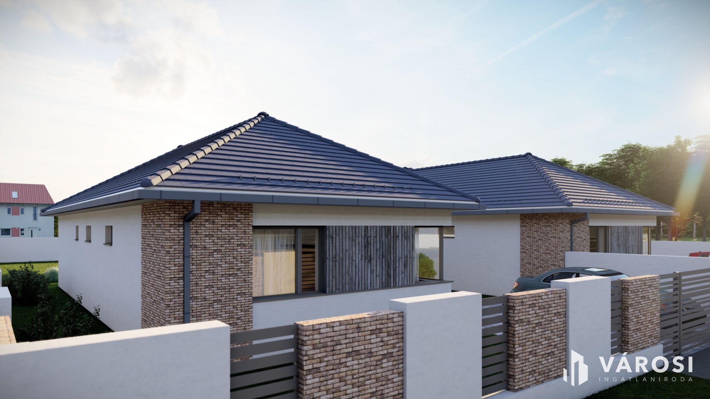 A házban tágas amerikai konyhás nappali + 3 kényelmes szoba, gardrób, valamint külön fürdő és WC kap helyet.