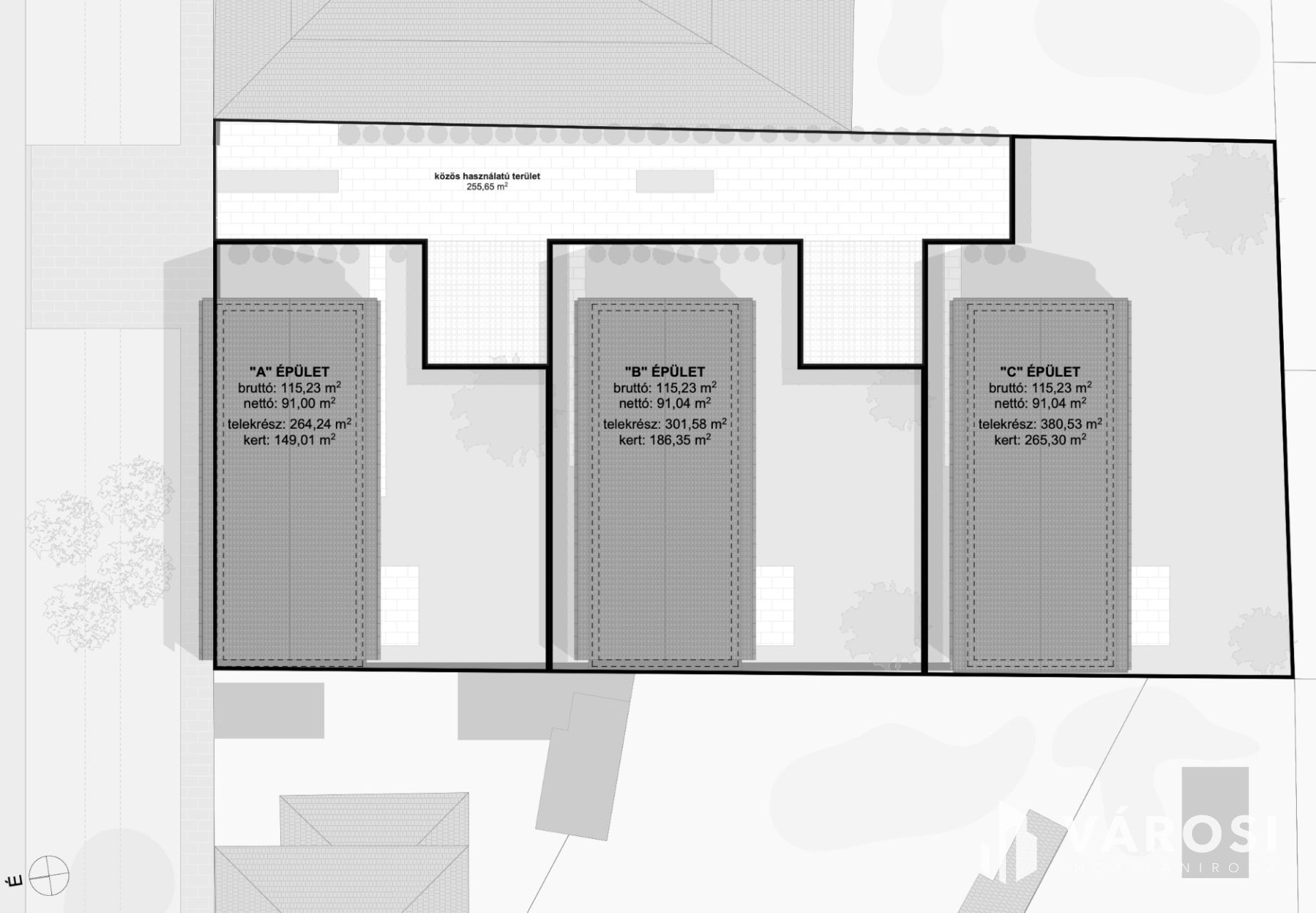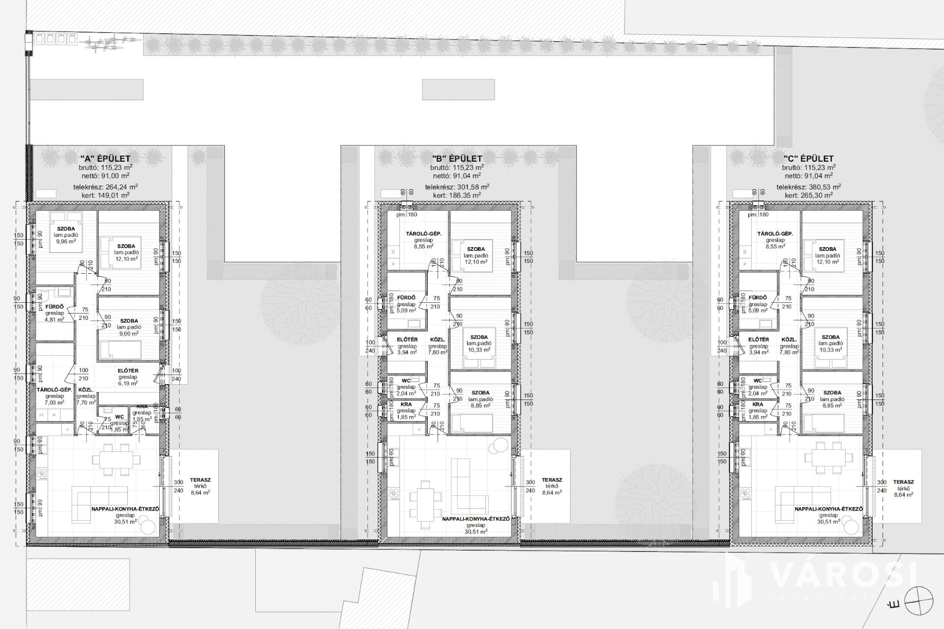 "B" épület: 91,04 m2 lakórész / 186,35 m2 kert / 301,58 m2 telek