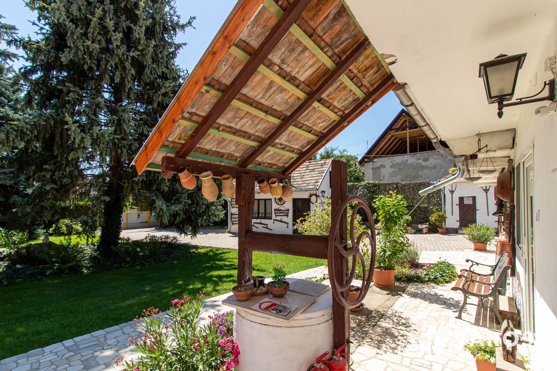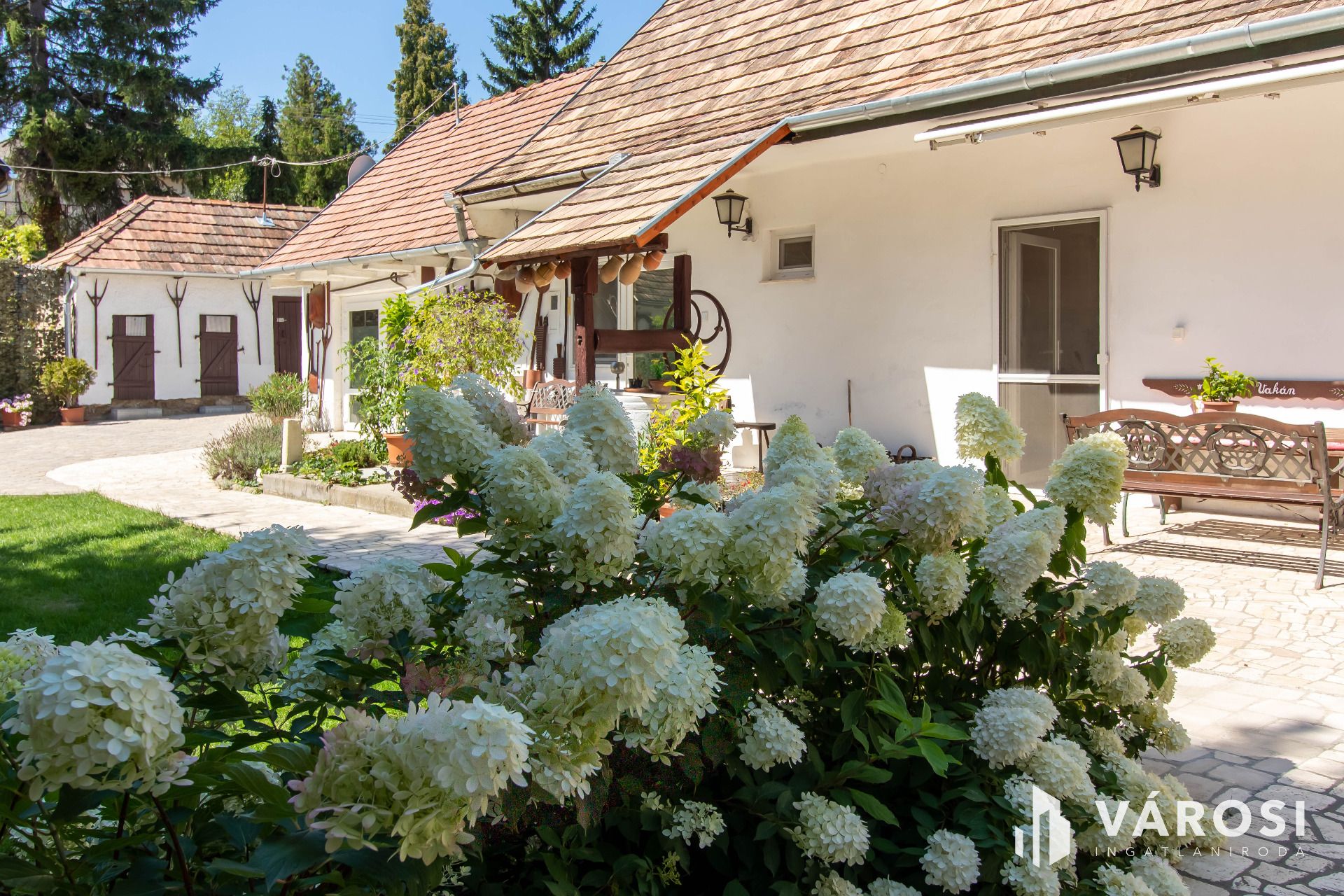 Gyönyörűen parkosított udvar örökzöldekkel, kerti tó, tágas világos napsütötte teraszok